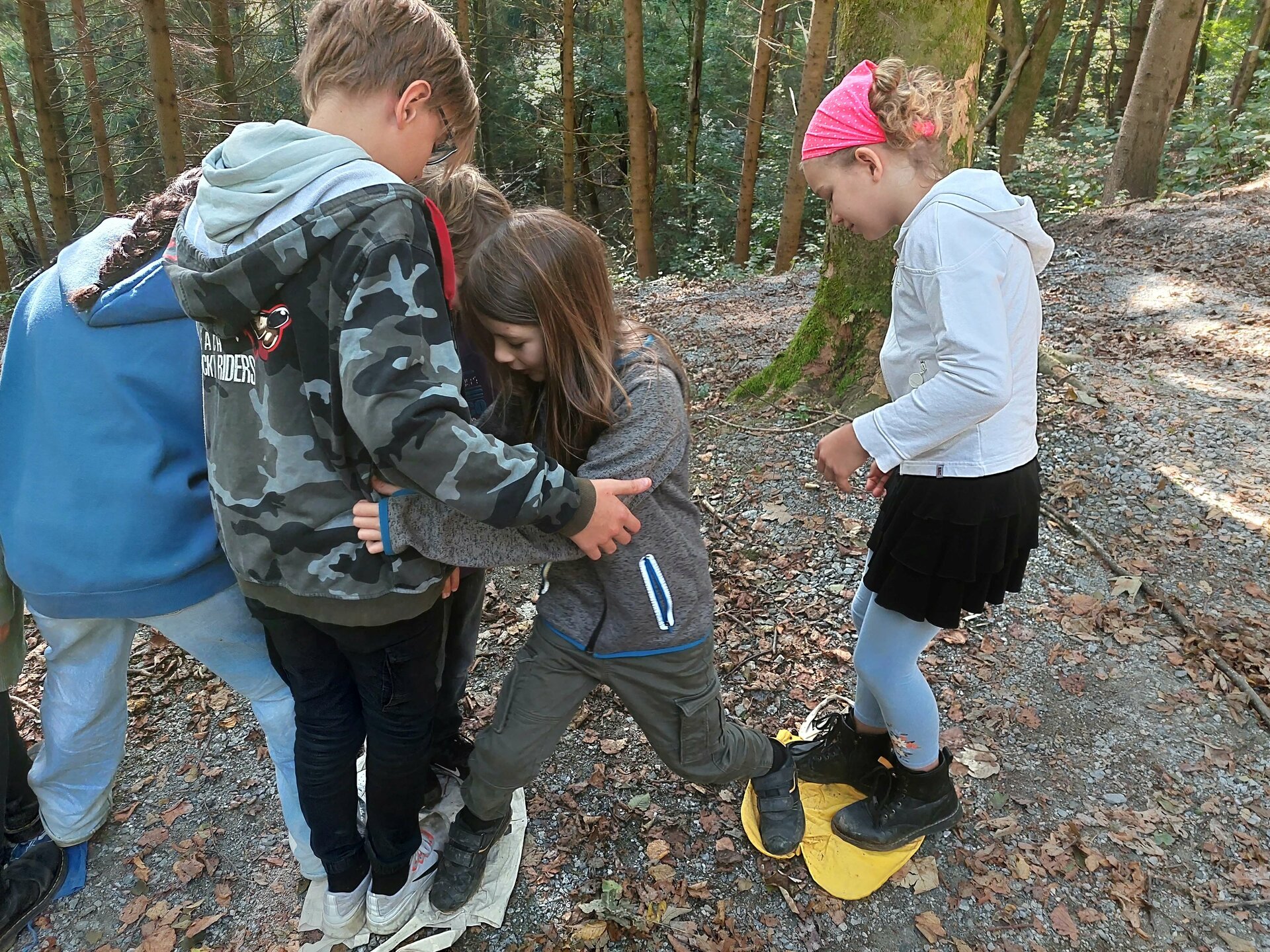 Die dritte Station war der „Schokoladenfluss“, betreut von Ines und Daniela. Hier galt es einen Abstand von 5-10 Metern mit 17 Baumwollbeuteln gemeinsam zu überwinden. Jede Klasse musste zusammenhelfen. Der Fluss konnte nur mithilfe der Taschen überquert werden, dabei musste jede Tasche immer mit einem Fuß berührt sein, sonst wurde diese weggespült. Am Ende standen acht Kinder auf vier Taschen. Wir hatten sehr viel zu lachen!