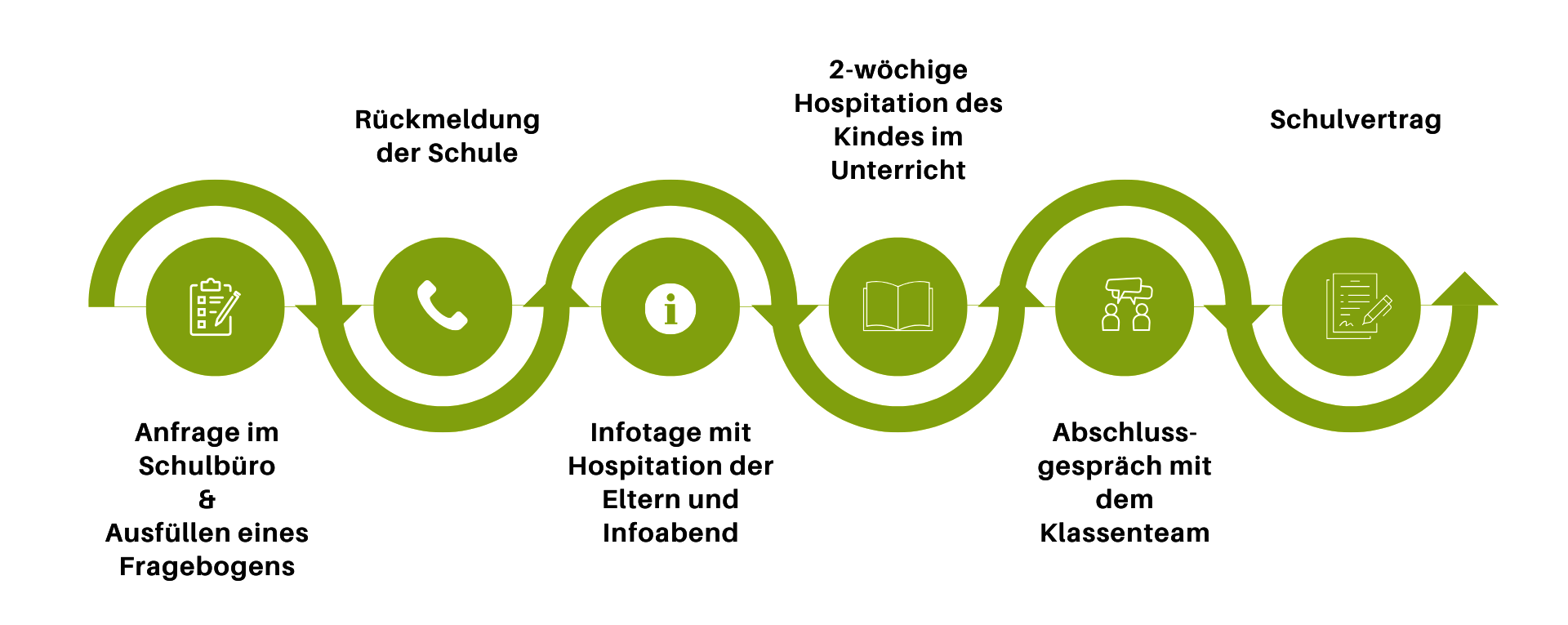 Hier sehen Sie, welche Schritte für die Aufnahme Ihres Kindes auf die Warteliste und letztendlich an unsere Schule nötig sind.